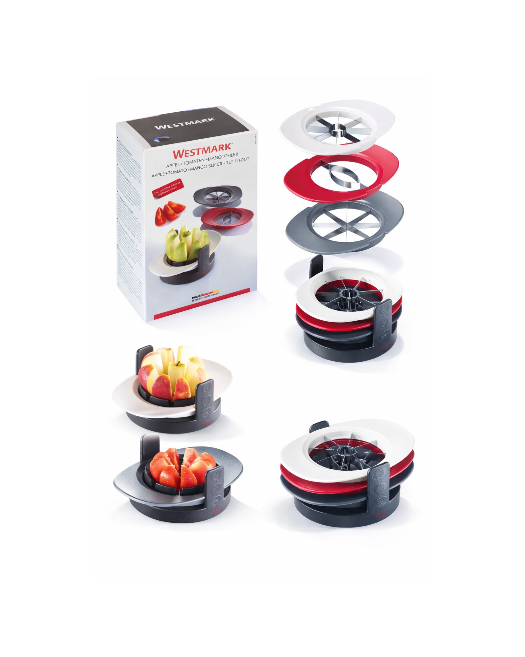 Save space in your kitchen with this versatile multi-slicer featuring 3 interchangeable inserts designed for apples, tomatoes, and mangoes. Each insert is equipped with sharp or serrated stainless steel blades to ensure smooth, precise cutting every time.