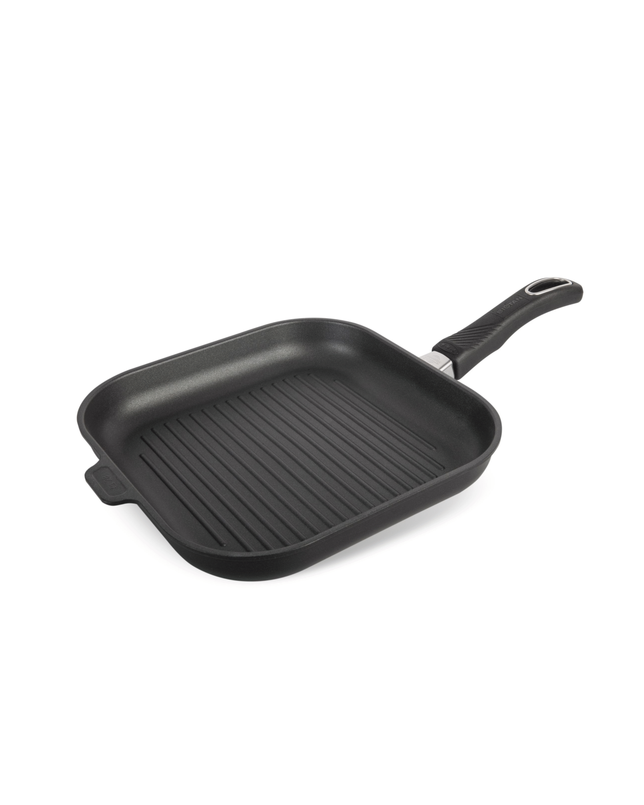 A 28 cm grill pan with ridged surface for authentic grill marks, even heat distribution, and a comfortable handle—perfect for healthier indoor grilling.