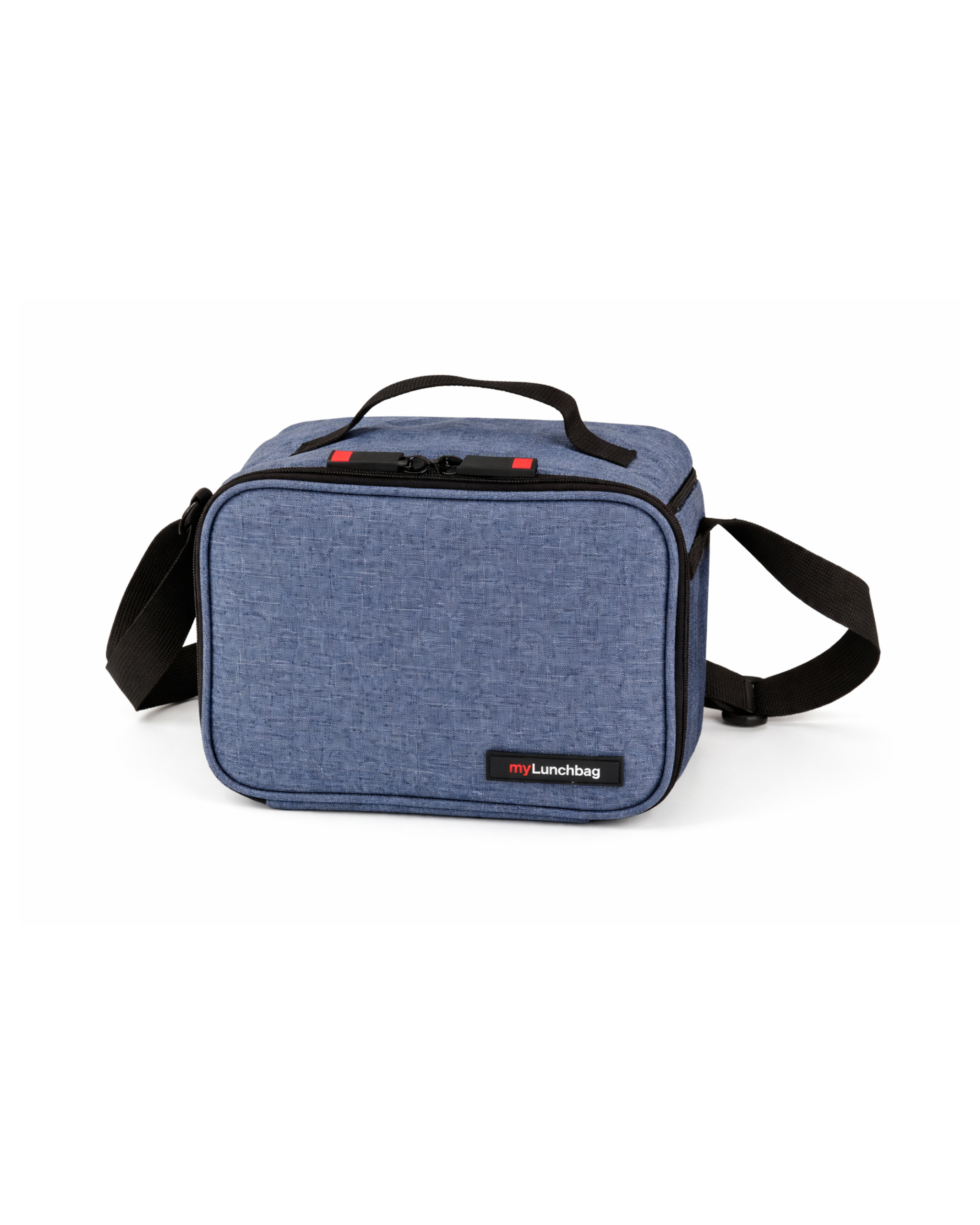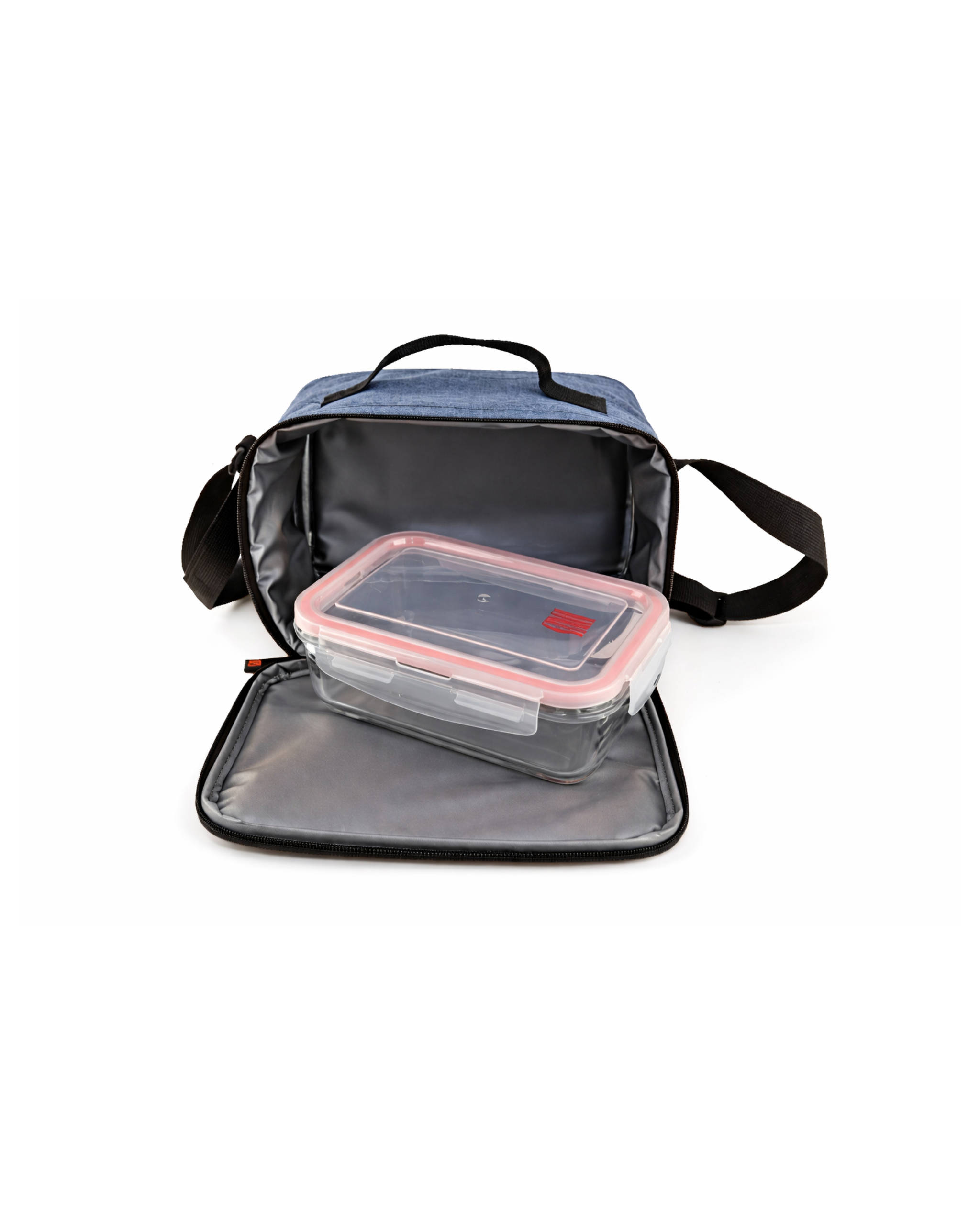 The lunch bag features thick thermal fabric to maintain food temperature during transport.