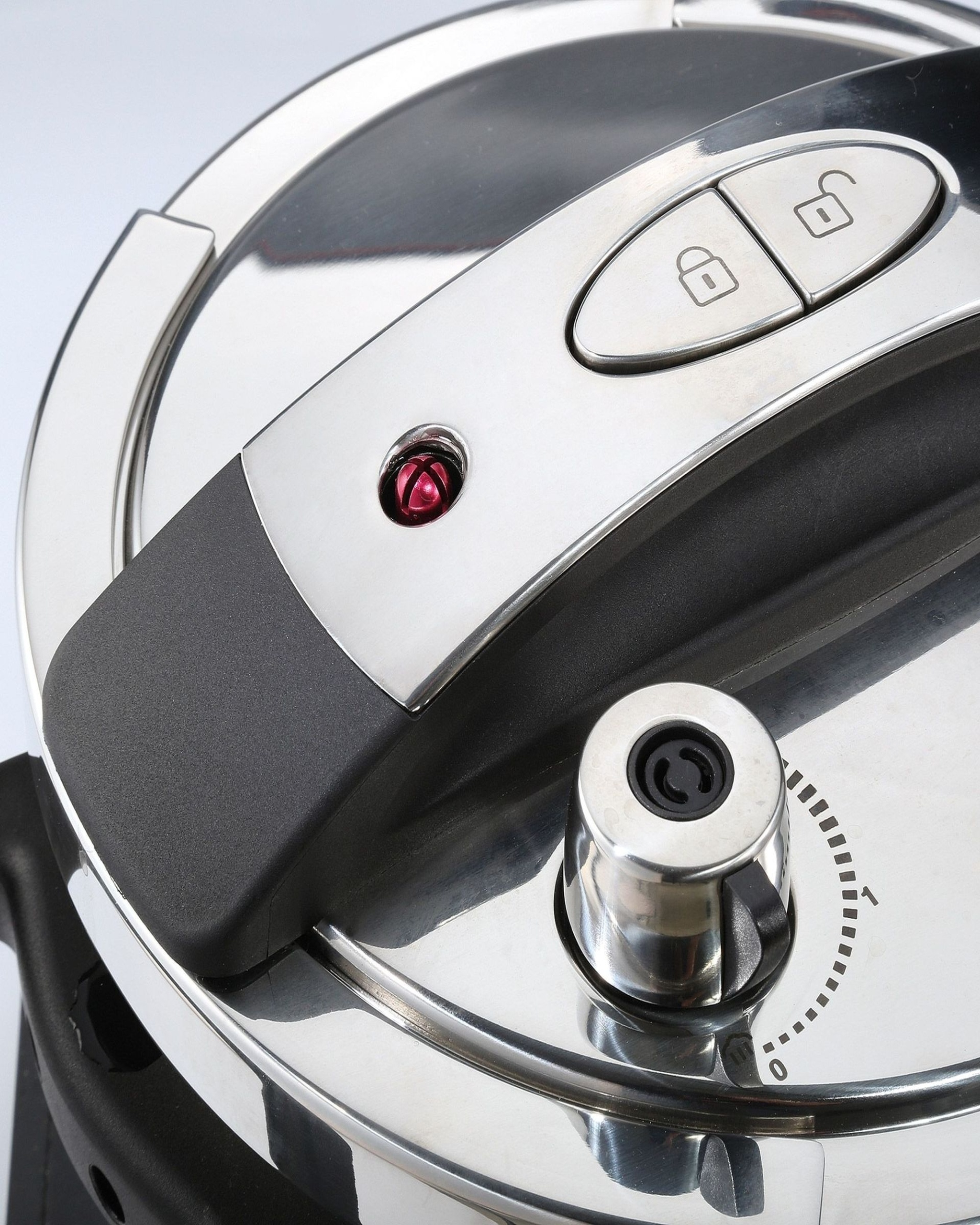 The pressure cooker features an extra?strong multi layer base?for?optimal heat distribution?and heat transfer. A?practical internal scale?as well as a?one hand locking system?support comfortable handling. The scope of delivery includes a?steaming insert?and a?rack.?For safety reasons, the lid should always be closed using both hands.