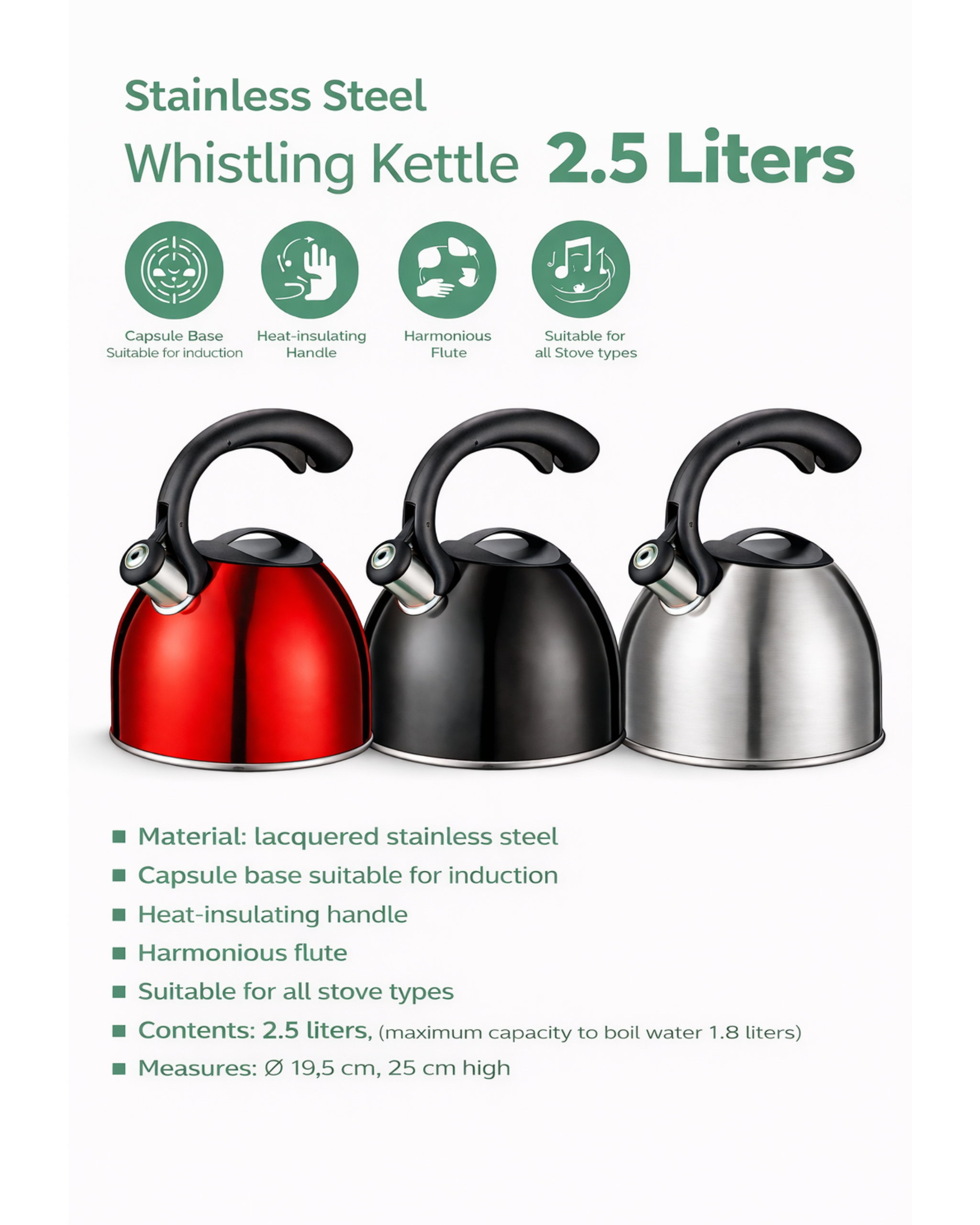 Upgrade your kitchen with this stylish and durable whistling kettle, crafted from high-quality lacquered stainless steel. Designed for both performance and elegance, it ensures fast and efficient boiling while complementing any modern kitchen setup.